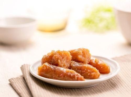 - きわめんたい 中辛 すけとうだらの卵巣(ロシア)、かつお出汁、黒糖、食塩、醤油(小麦、大豆を含む)、昆布出汁、清酒、本みりん、唐辛子、かつお