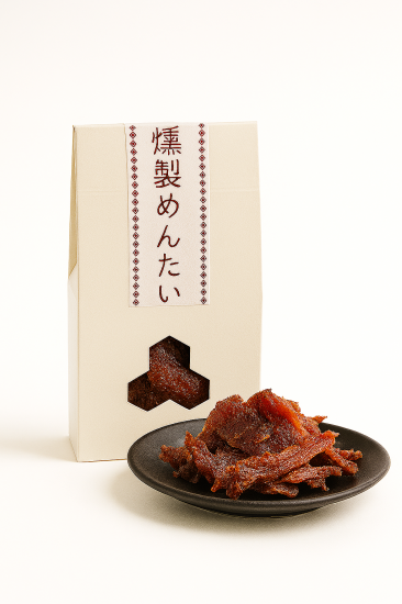 明太子の皮だけを使った燻製おつまみ「燻製めんたい」。凝縮された旨味と食感、香ばしい燻製の香りはビールや日本酒のお供に最適。常温保存で手軽に楽しめます。